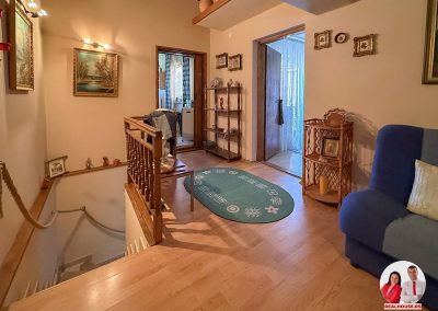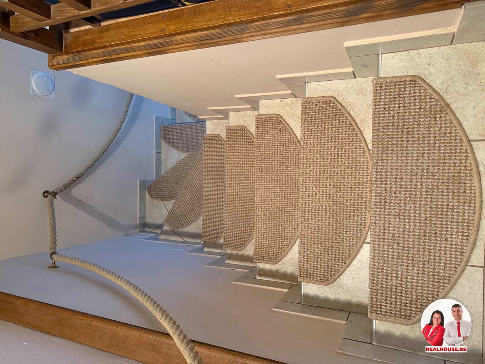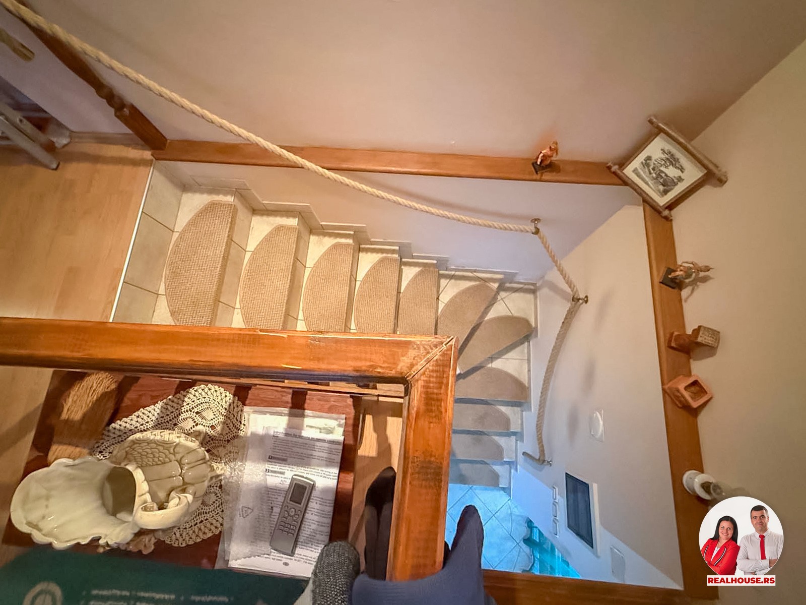 Na spratu se nalazi dnevni boravak i dve spavaće sobe sa standardnom visinom plafona, što prostoru daje prijatan i porodičan karakter.