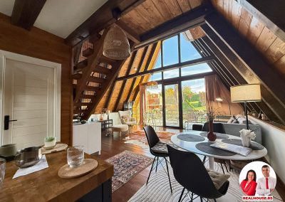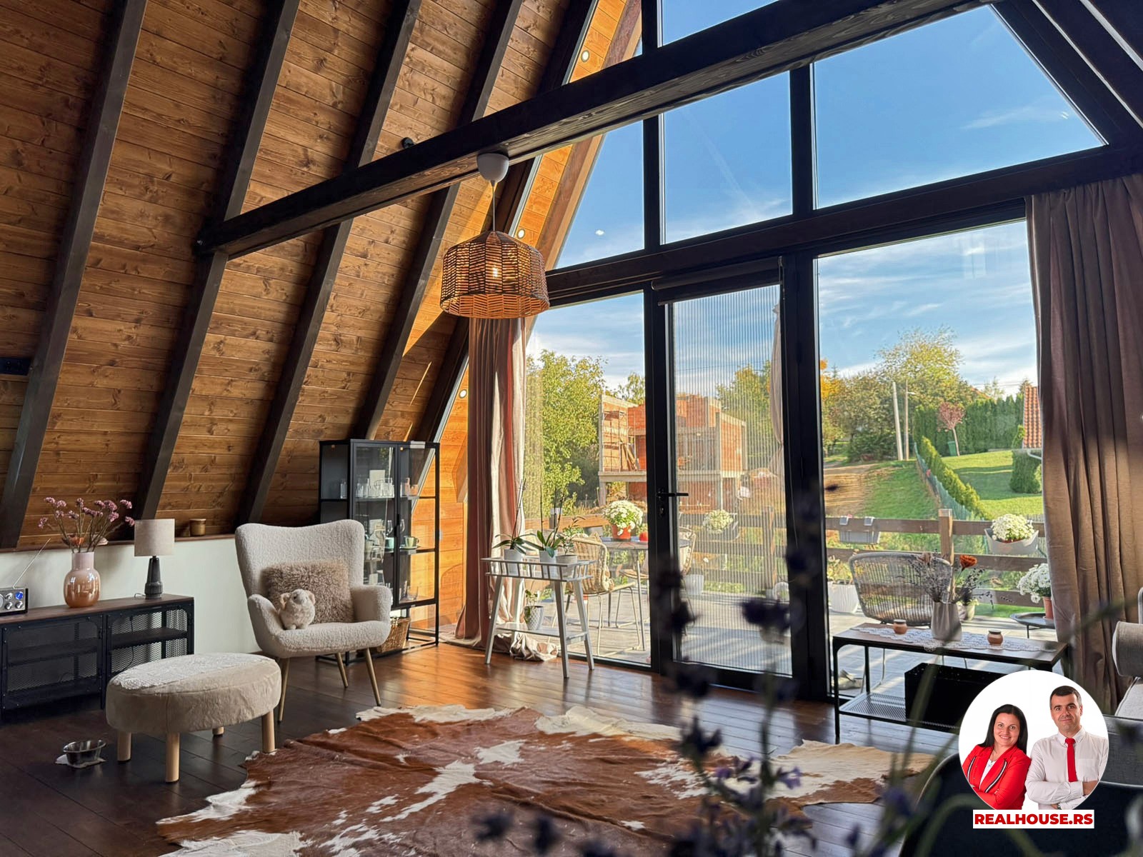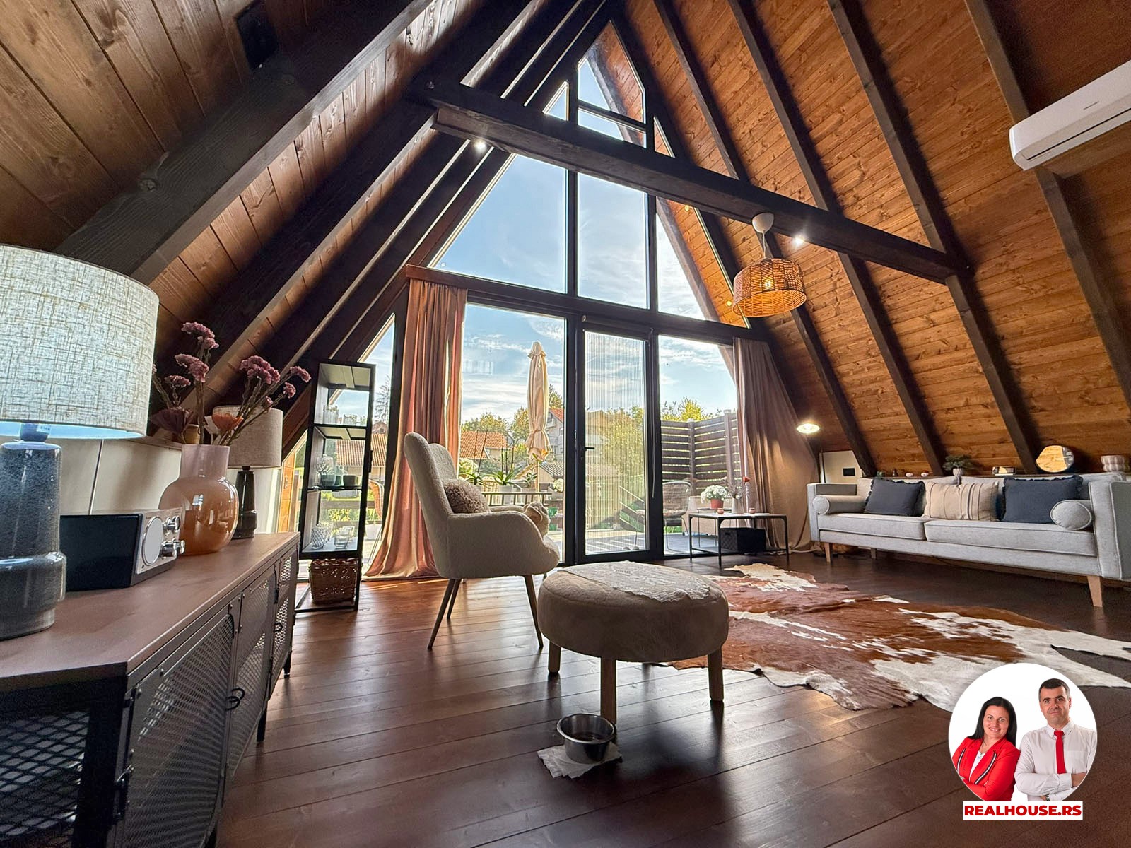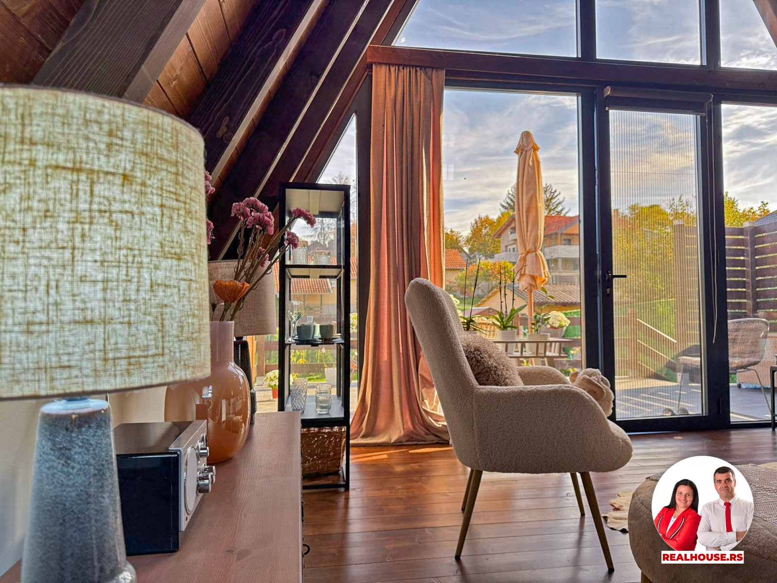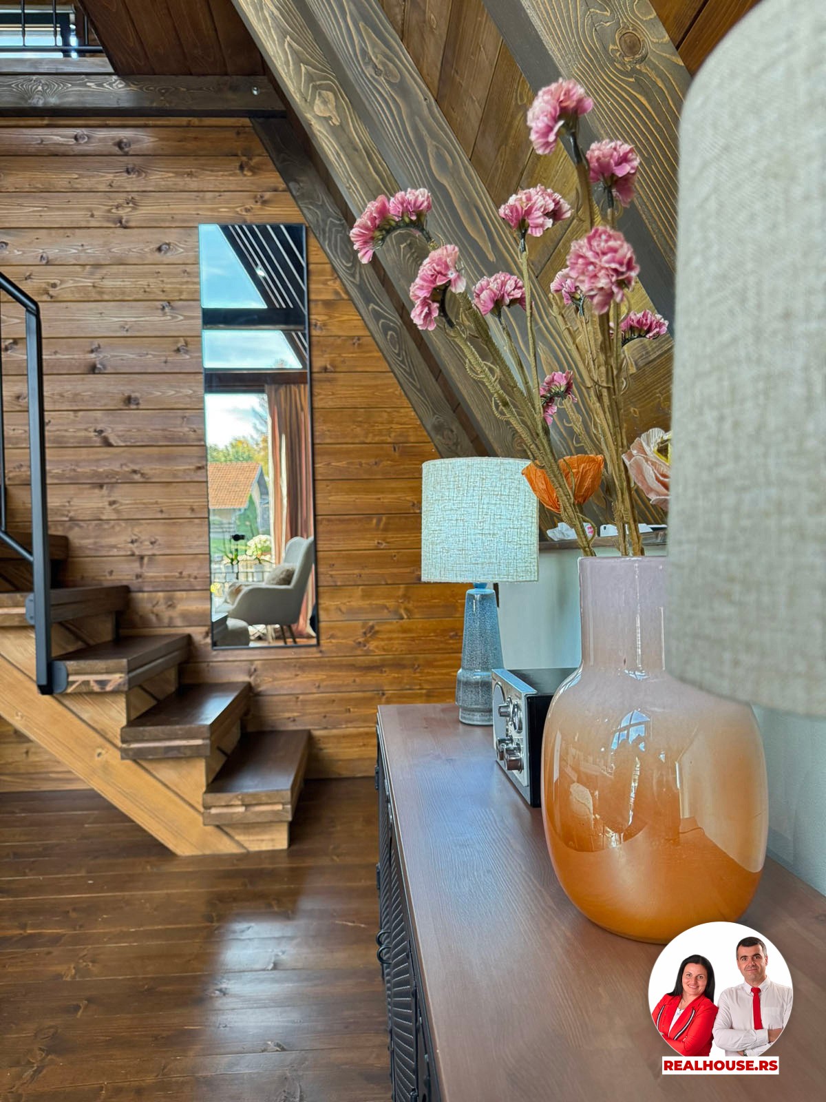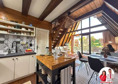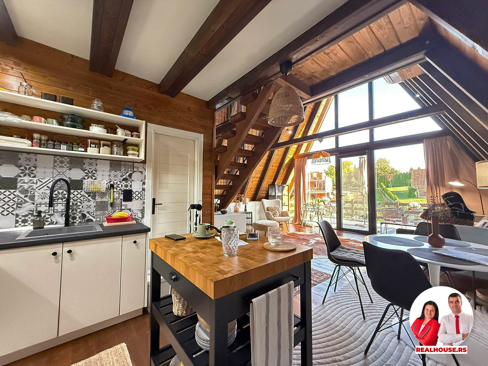 Drvo naravno dominira i ono mu daje toplinu a velike staklene površine celom ambijentu daju posebnu notu zbog povezanosti sa spoljašnjom sredinom pa prostor deluje prozračno i prijatno. U svakom uglu se vidi koliko se vodilo računa o detaljima a svaki kutak ove kuće Vas mami da stanete, pogledate i uživate.