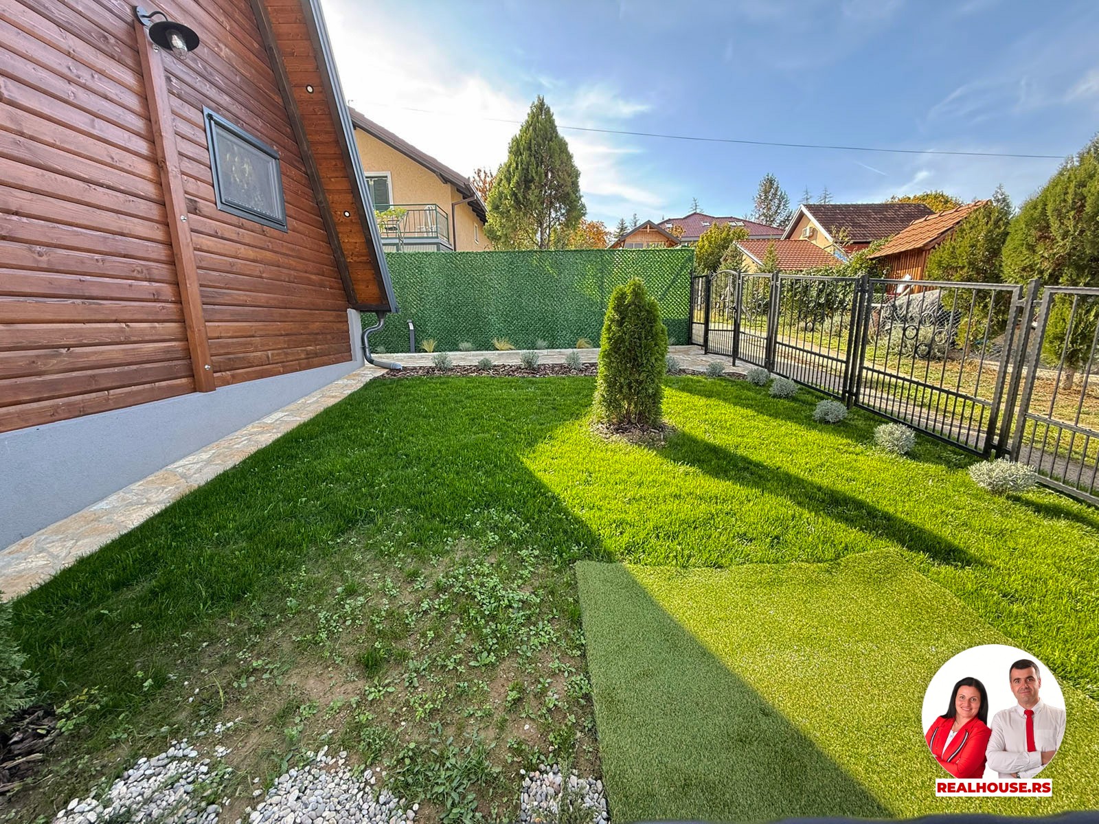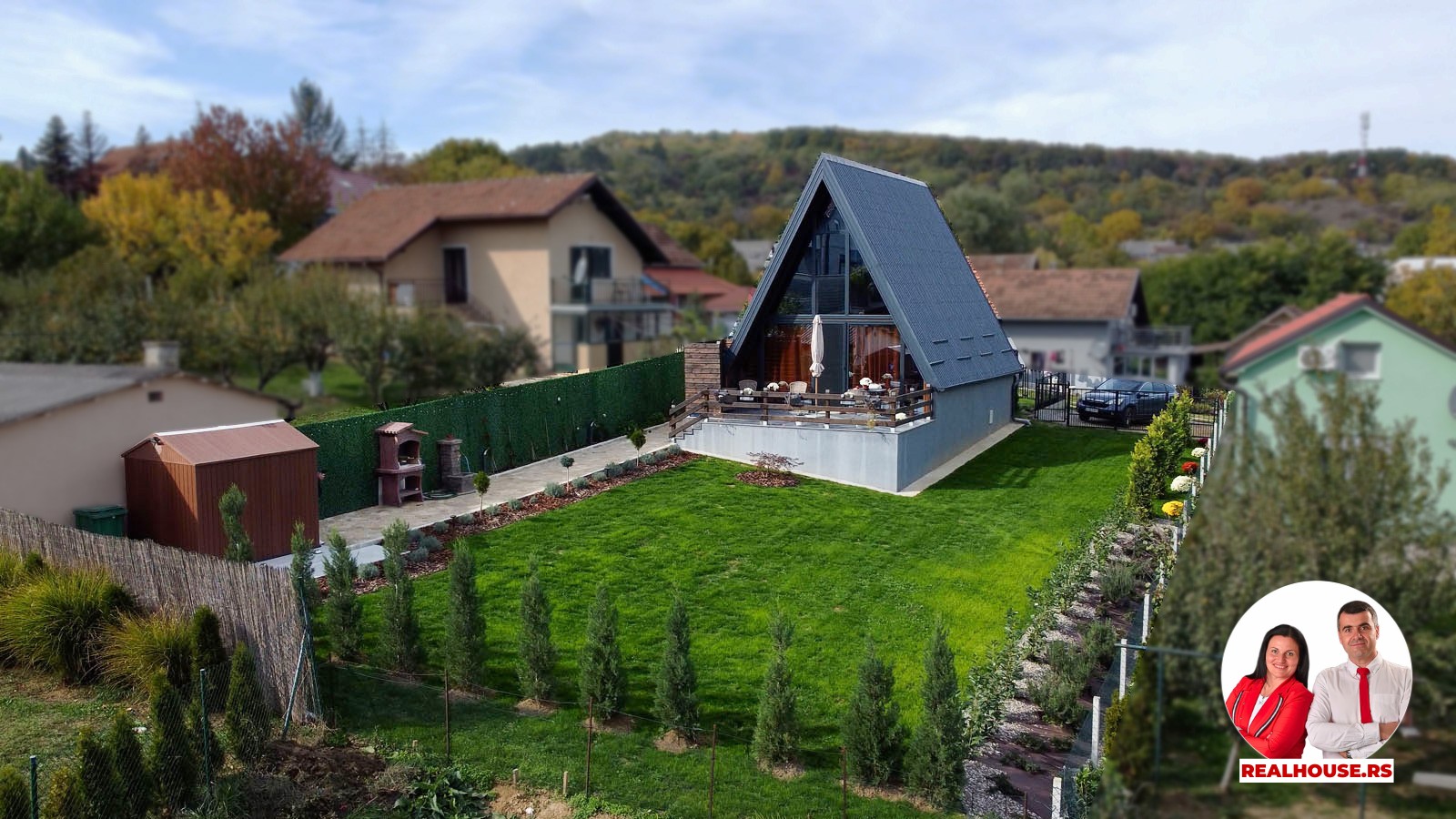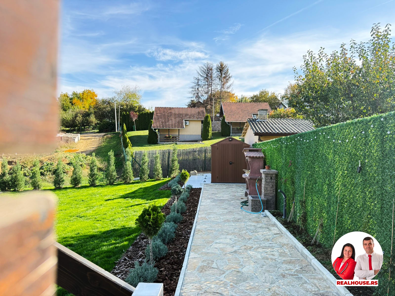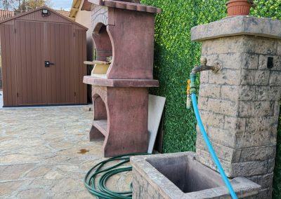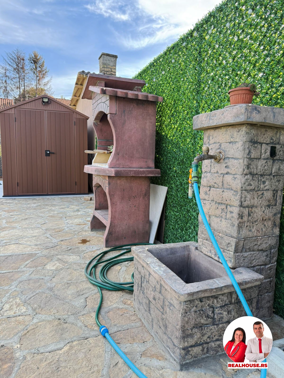 U dvorištu je i jedna modularna pomoćna prostorija- praktično i diskretno rešenje za alat, baštenske potrepštine i za sve drugo što želite da Vam je pri ruci ali ne i na vidiku. Pored nje je i zidani roštilj spreman za dobar ručak ili laganu večeru sa porodicom i prijateljima.