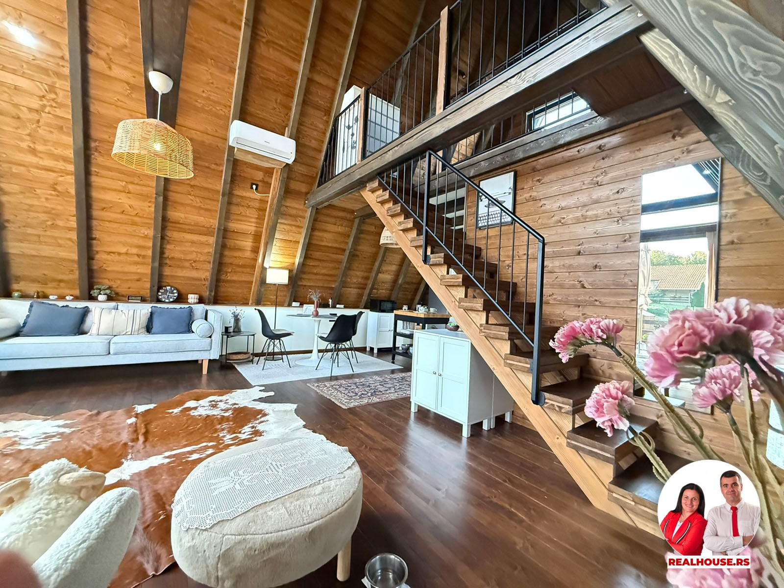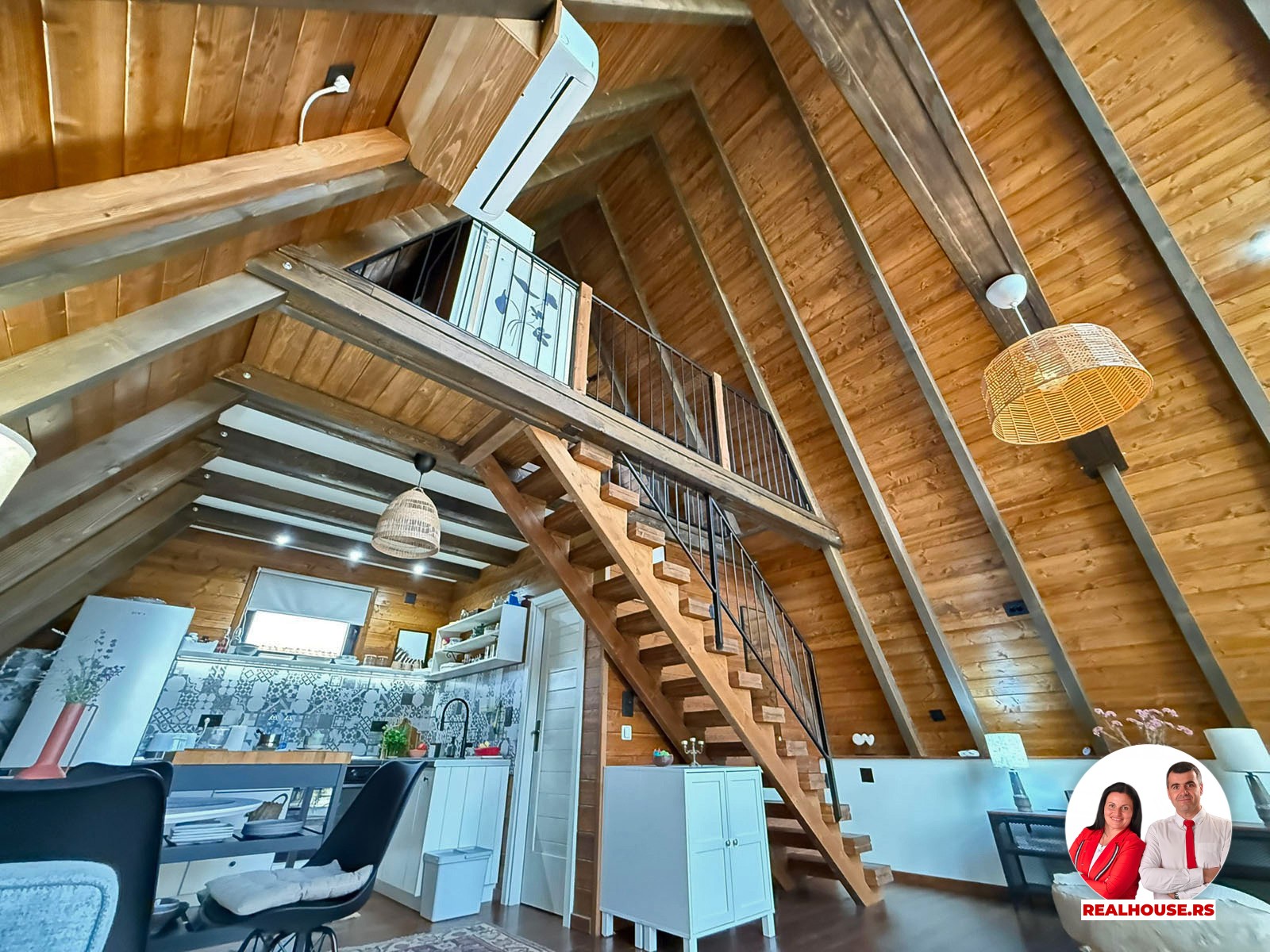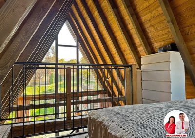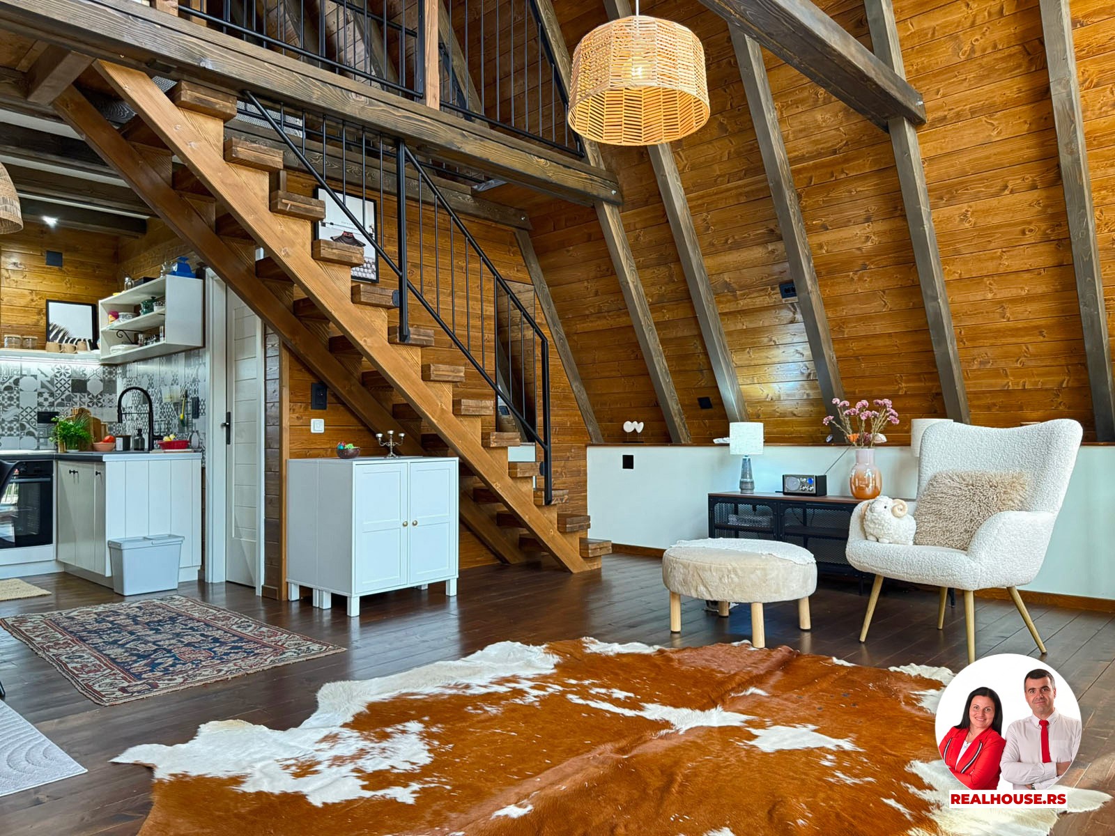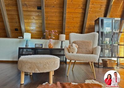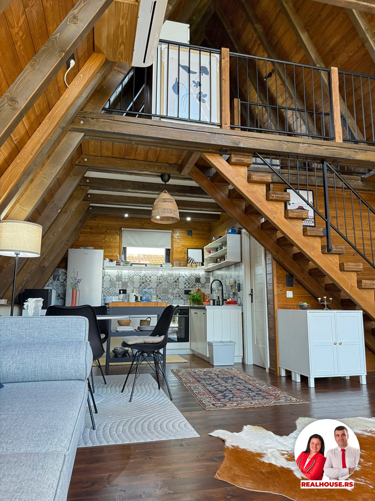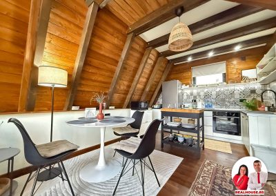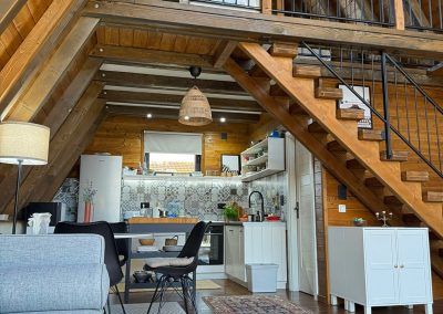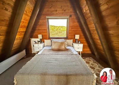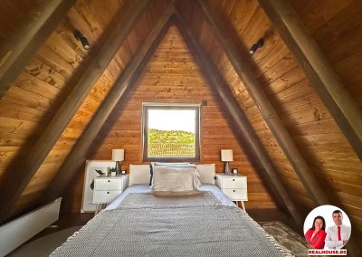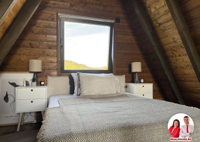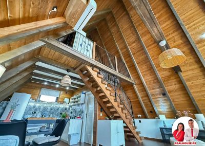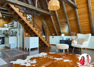 Ova kuća je potpuno nova, tek završena i čim smo kročili unutra shvatili smo da je svaki detalj brižljivo biran ne po modi nego po osećaju. Brvnara je neto površine površine 89 m2 i sastoji se od dnevnog boravka sa kuhinjom i terpezarijom po principu otvorenog koncepta, kupatila i terase na donjoj etaži a tu je i galerija na kojoj je smeštena spavaća soba i dokoje vode drvene stepenice.